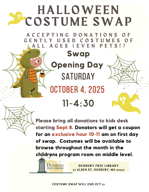 October 4, 2025 from 11:00 am - 4:00 pm, Duxbury Free Library seeking donations of gently used kids/adults/pets costumes for a swap that will be hosted at the library