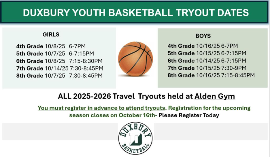 We are excited to announce that Duxbury Youth Travel basketball registration is now open for the 2025-26 winter season for grades 4-8!π