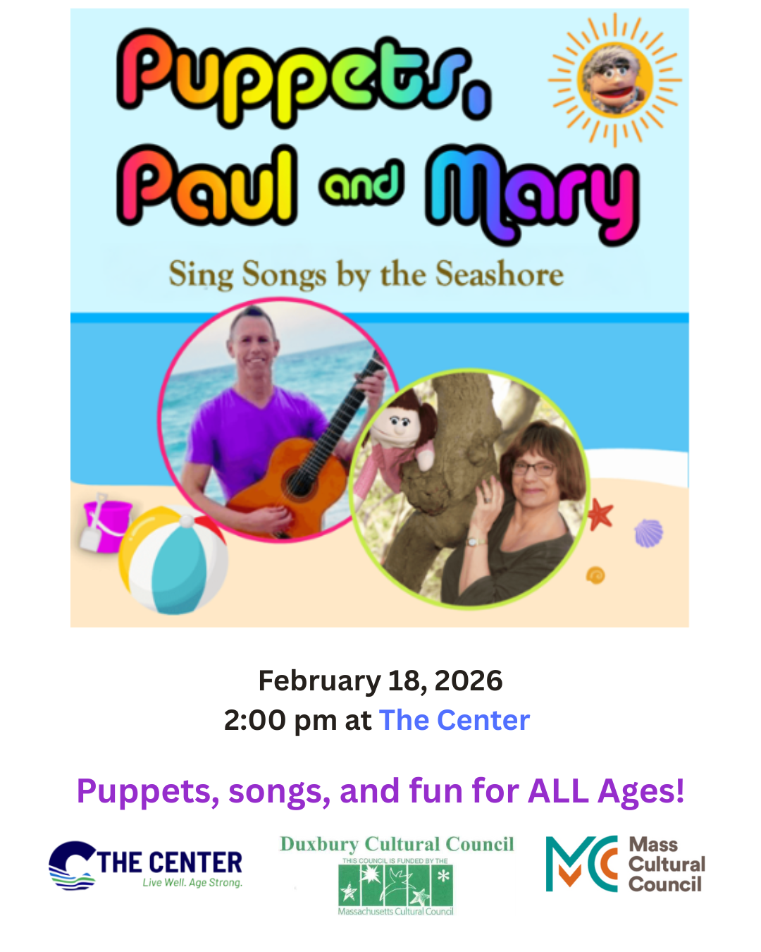 A live puppet show with sing along. For more information and to register CLICK HERE. We hope to see you at THE CENTER on 2/18/26 at 2 pm.